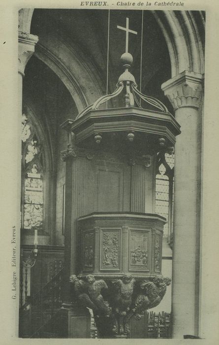 Cette chaire à prêcher provient de l'abbaye du Bec-Hellouin. Elle est considérée comme l'oeuvre d'un religieux de ce monastère, frère Guillaume de la Tremblaye, qui, du moins, présida à son exécution en 1675.