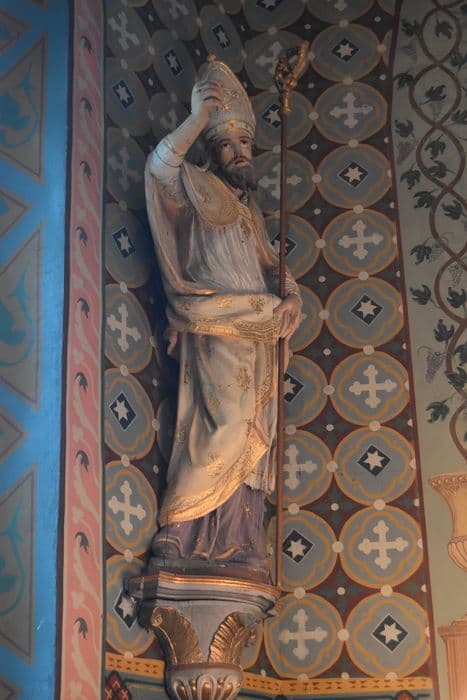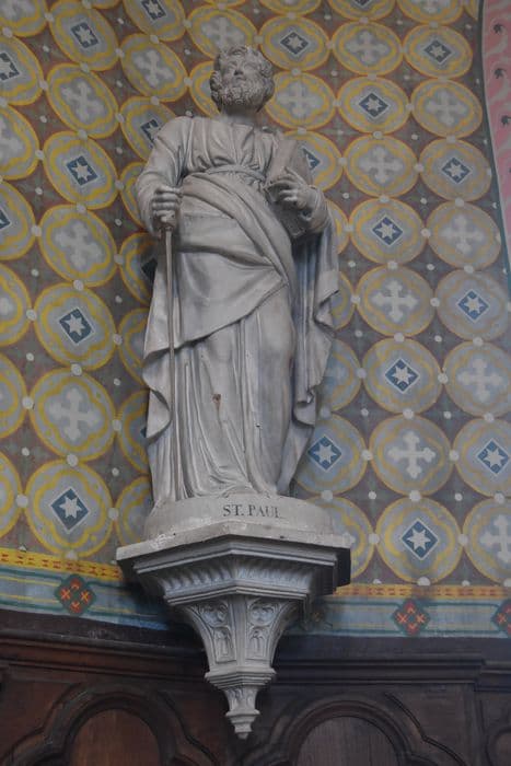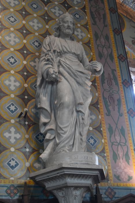 six statues : Saint Joseph, Sainte Geneviève, Saint Pierre, Saint Paul, Saint évêque (Saint Martin ou Saint Sulpice ?) et Sainte Philomène