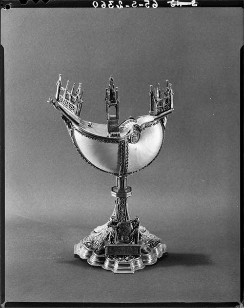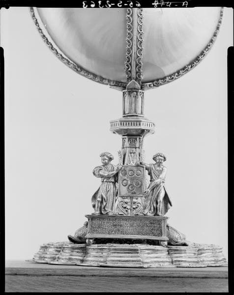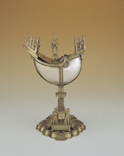 Coquille de nautile décapée retenue par des bandes d'argent doré et montée en forme de navire sur un pied ; la réserve à encens s'ouvre par une trappe dans le pont.