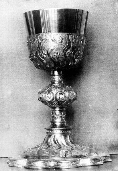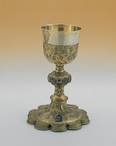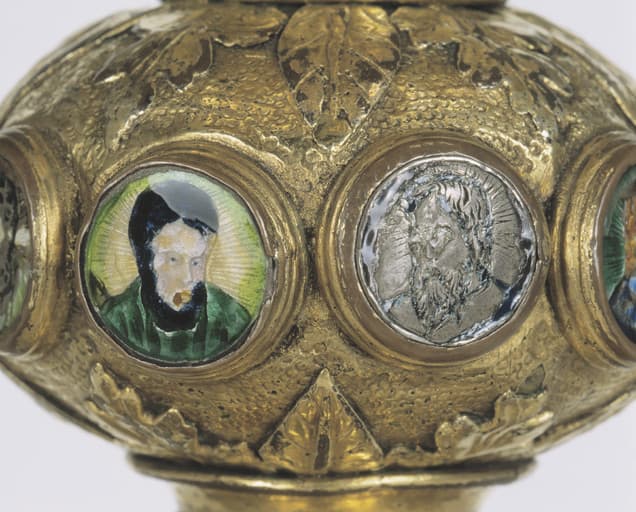Assiette d'apprêt marron, noeud décoré d'émaux translucides ; pied à 10 lobes, tige d'enfilage.