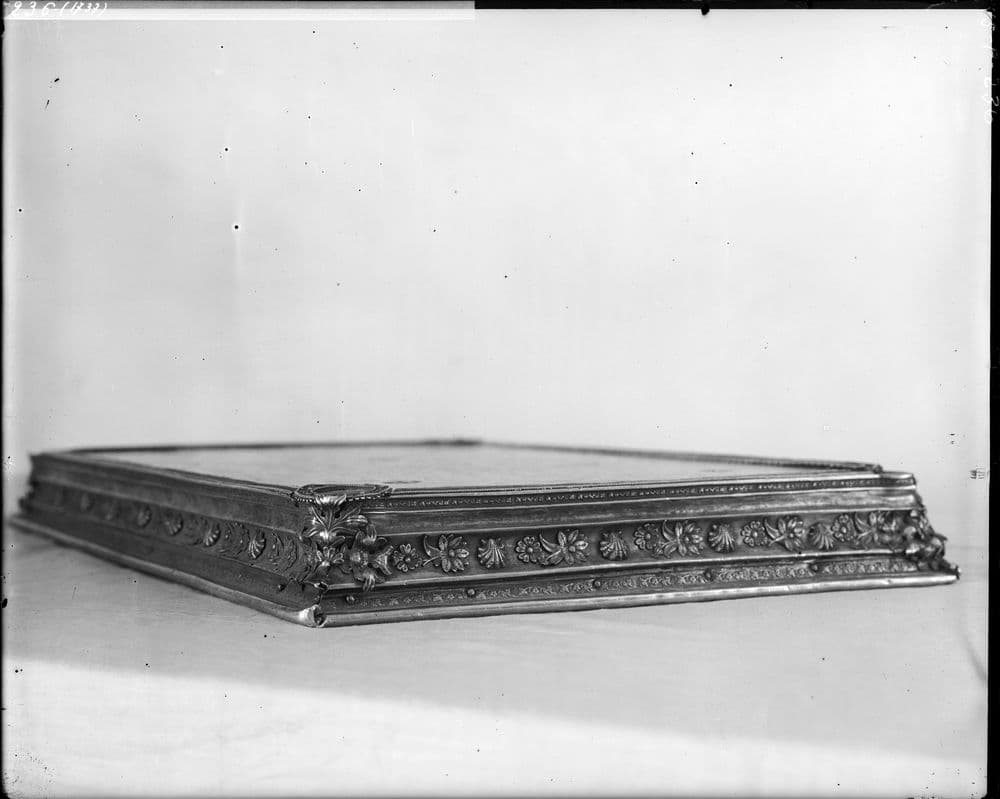 mica (gris) : taillé ; argent : doré, ciselé, estampage, décor rapporté