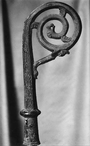 Crosse emmanchée dans un bâton de bois fixé sur un socle.