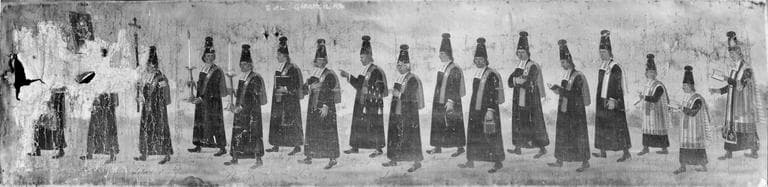 Procession de prêtres en vêtements liturgiques, certains ont le regard tournés vers l'extérieur du tableau.