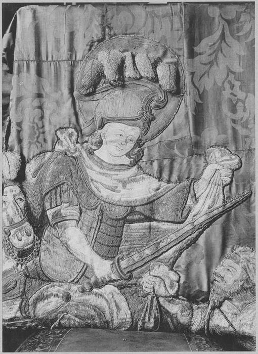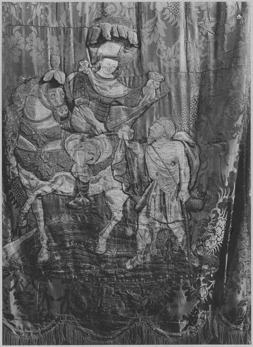 bannière de procession brodée avec représentation de la Charité de saint Martin et de l'Assomption de la Vierge