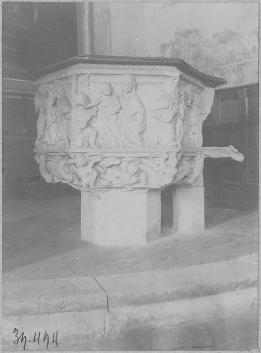POP | Plateforme ouverte du patrimoinefonts baptismaux : Vierge à l'Enfant entre deux anges musiciens, le Baptême du Christ, incrédulité de saint Thomas (l'), personnages présentant un écusson