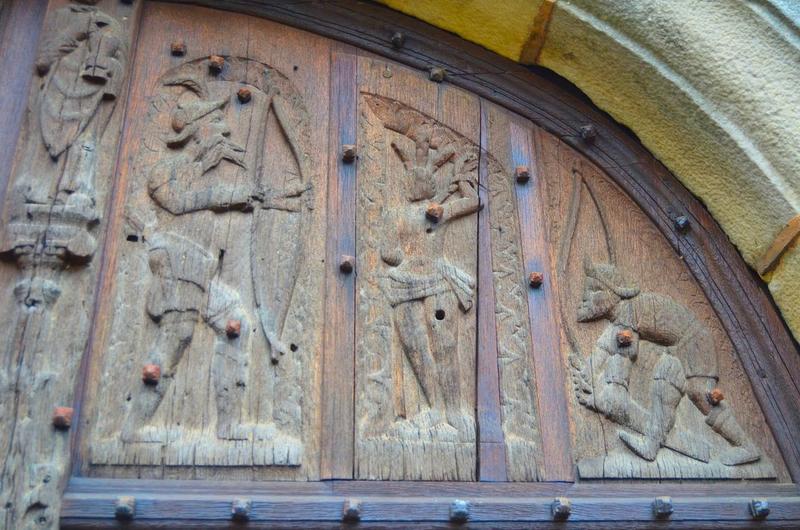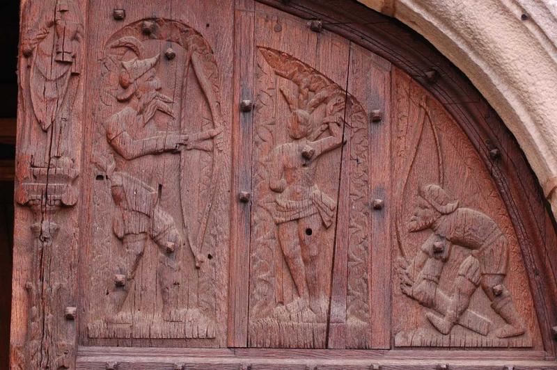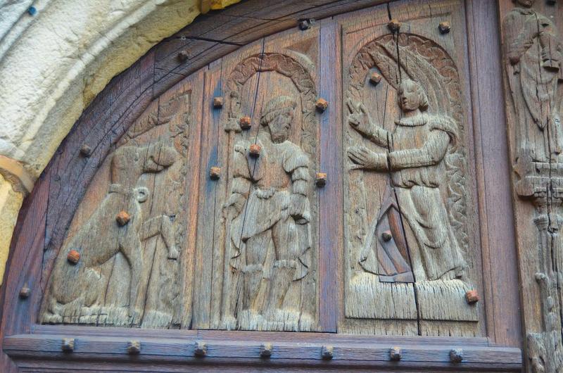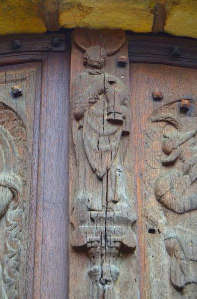 Registre supérieur du vantail gauche : saint Roch de Montpellier entre son chien et l'ange ; registre supérieur du vantail droit : saint Sébastien entre deux archers bourreaux tendant leur arc ; à la partie supérieure du trumeau, un prêtre tient le ciboire et présente l'hostie.