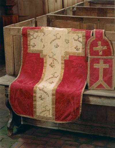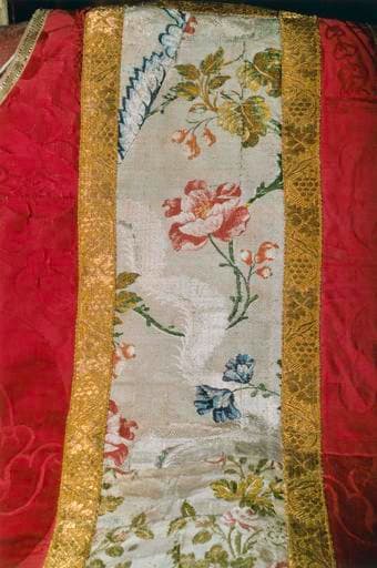 Chasuble, manipule et bourse de corporal en damas rouge à gros motifs végétaux. La chasuble présente sur la face une réserve rectangulaire de soie brochée à fleurs et feuillages colorés sur fond blanc, délimitée par un galon de fils d'or. Au dos, la réserve prend la forme d'une grande croix de tissu blanc à pâles rayures et branches fleuries, délimitée par un galon de fils d'or différent de celui de la face.