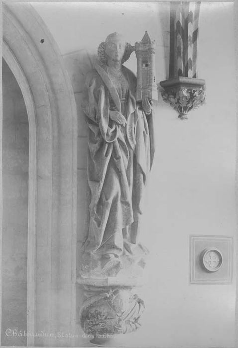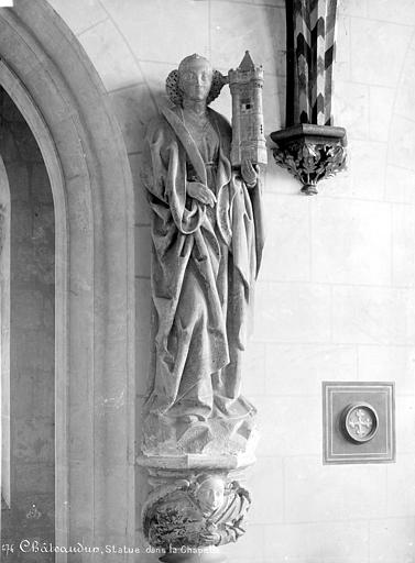 Jean d'Orléans, fidèle du dauphin Charles, compagnon de Jeanne d'Arc, reçut en 1439 le comté de Dunois et la vicomté de Châteaudun où il établit sa résidence principale. En 1451, il décida de bâtir une chapelle à l'emplacement de l'ancienne chapelle Notre-Dame du château. Dès l'origine, envisagée comme sainte-chapelle, elle fut dédiée à la Vierge, à saint Jean-Baptiste et aux saints anges. Ce château bénéficie d'une importante étude réalisée par Monique Chatenet, qui a repéré trois campagnes de travaux : de 1451 à 1454, de 1460 à 1464 et autour de 1493. Cette chapelle présente deux niveaux : une chapelle haute dédiée à saint Vincent et une chapelle basse où se trouve l'ensemble de sculptures formant le programme de la sainte chapelle voulue par Jean Dunois. La chapelle abrite 15 sculptures (PM28000979 à PM28000994) disposées sur des colonnes surmontées de chapiteaux. Elles sont détachées du mur et posées avec un joint de scellement sur ces chapiteaux. On peut en isoler 3 : les sculptures de sainte Agnès (PM28000993) et de saint François d'Assise(PM28000992) datées autour de 1493, de plus petites dimensions et celle de Jean Dunois (PM28000994), conçue sans doute pour un édifice civil. La décoration date de la campagne de travaux de 1460-1464. Elle comprenait 12 statues aux chapiteaux décorés d'anges. On note l'inspiration réaliste dans les attitudes et les draperies et le côté idéalisé avec les proportions allongées des corps et les expressions des visages. Les vêtements reçurent une riche polychromie encore bien conservée. L'iconographie reprend la dédicace à la Vierge, datée vers 1400 et à saint Jean-Baptiste. Pour le reste des sculptures, l'iconographie est à rapprocher de l'illustration du livre d'heure de Dunois, conservé au British Museum (Londres), et décoré à Paris vers 1440, à l'exception de sainte Radegonde (PM28000989) qui fait l'objet d'une dévotion locale, comme sainte Madeleine (PM28000986). Cet ensemble présente d'une part une originalité dans le programme iconographique et d'autre part une qualité manifeste de la sculpture. Des rapprochements ont été fait avec l'art de la Bourgogne, la sculpture tourangelle (Val de Loire selon Elisabeth Taburet-Delahaye) et le Brabant (étude de Sophie Guillot de Suduiraut : groupe en rapport daté de 1460).