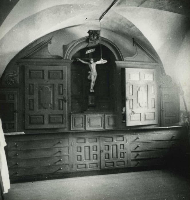 Meuble de sacristie et sa garniture intérieure en damas (?).