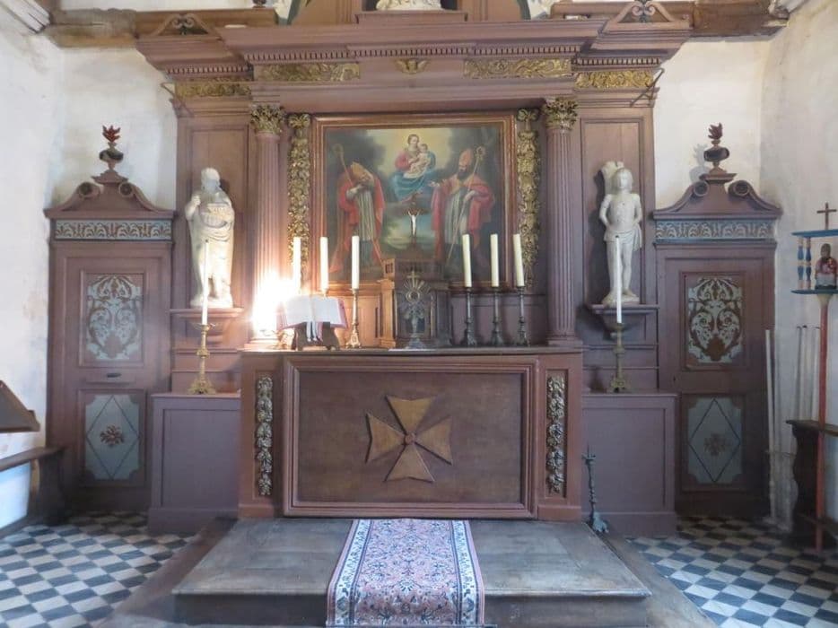 retable du maître-autel avec ses trois sculptures, son tableau Saint Denis et saint Eutrope, son tabernacle, ses emmarchements