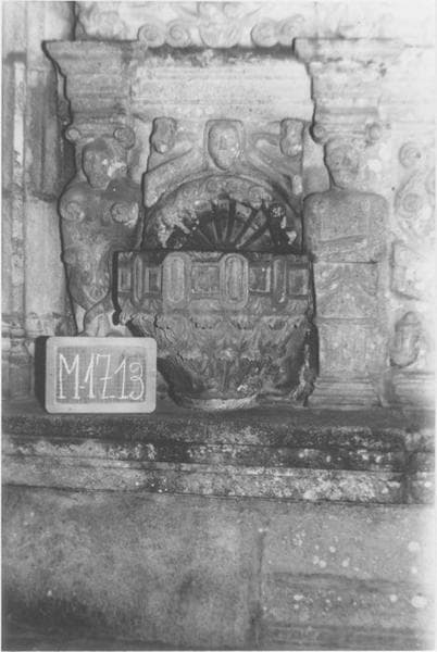Bénitier en granit ouvragé, placé à l'intérieur du porche latéral, à droite, entre deux cariatides sous une frise et des mascarons.