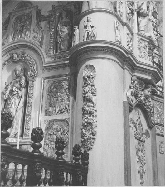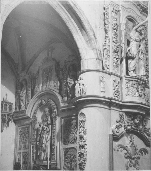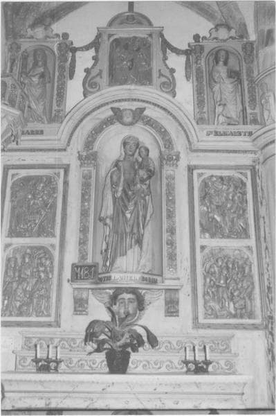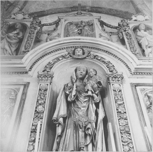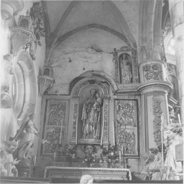 La statue de style gothique et les panneaux sculptés qui l'encadrent, forment les volets de la niche du retable.