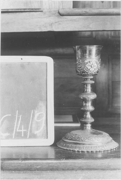Large pied à riche décor 18e siècle. Haute tige striée en cinq parties. Coupe et fausse-coupe modernes comme la patène.
