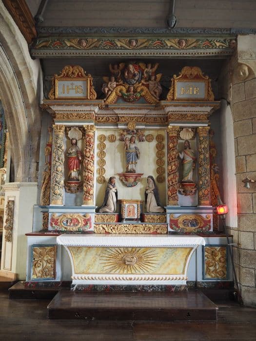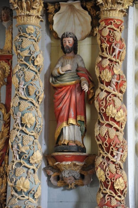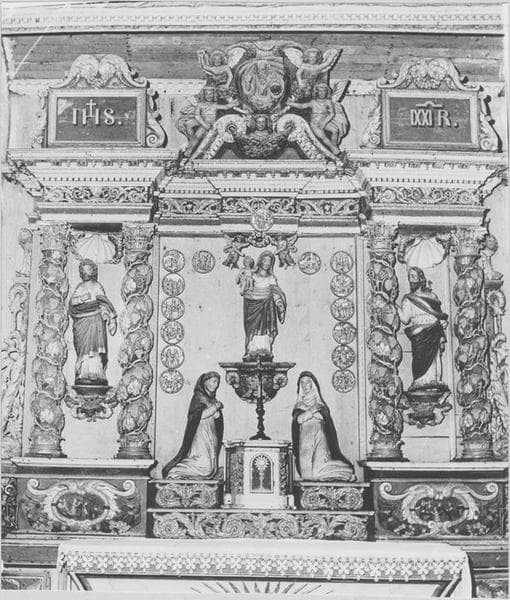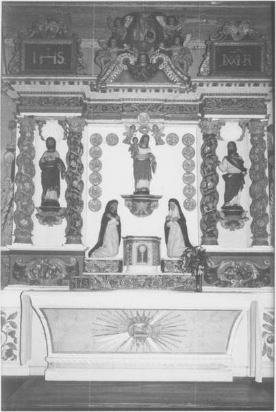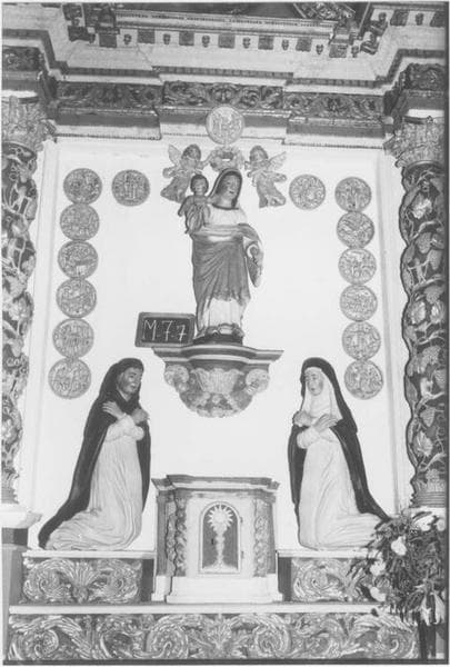 Quatre colonnes torses, au centre Vierge mère, saint Dominique et sainte Catherine de Sion (?) avec 15 médaillons, dans les niches latérales saint Joseph et saint Joachim, au-dessous des ces niches, deux médaillons.