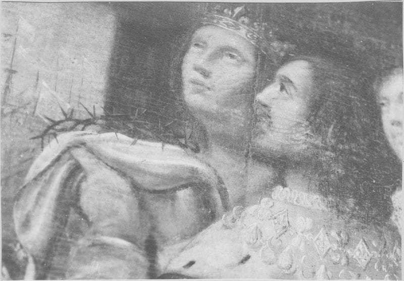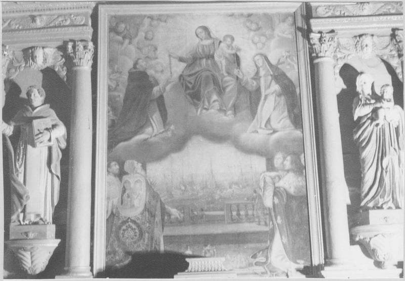 Sous la scène traditionnelle de la réunion du Rosaire par la Vierge à l'Enfant entourée d'angelots, la bataille navale de Lépante est encadrée de Louis XIII et saint Louis avec la couronne d'épines, et du pape et d'un serviteur.