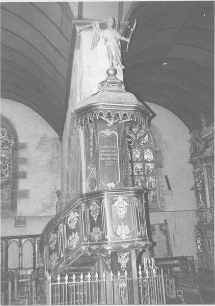 Un ange avec trompette et palme surmonte l'abat-voix. Colombe du Saint-Esprit sous l'abat-voix.