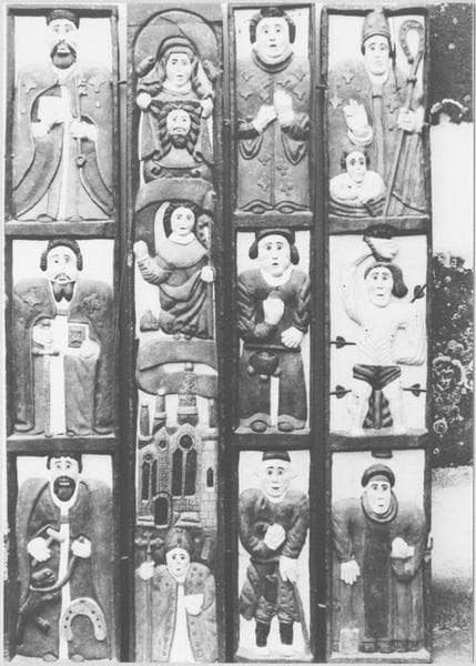 Les quatre volets de la niche sont ornés de 12 personnages, saint Pierre, saint Paul, saint Eloi, sainte Véronique, saint abbé, monastère, saint évêque, le riche, saint Yves, le pauvre, saint Nicolas, saint Sébastien et saint Fiacre.