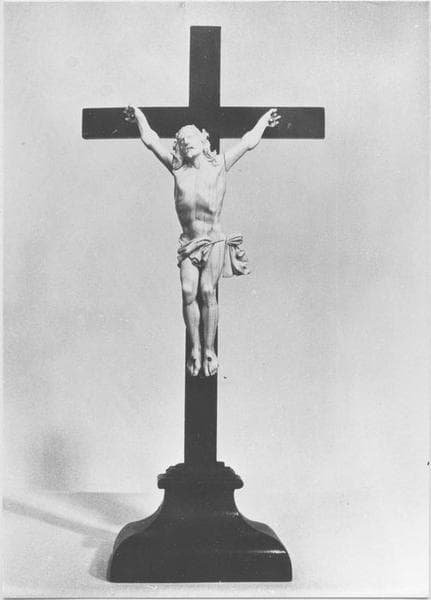 Pied rectangulaire en bois. Croix latine à branches de section rectangulaire. Crucifix en ivoire.