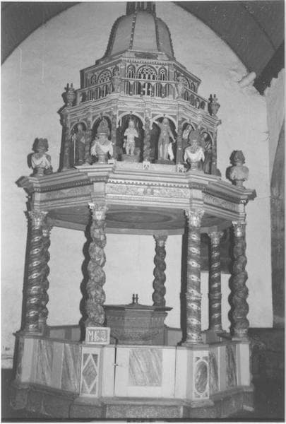 Cuve baptismale en granit à huit pans avec une petite cuve déversoir. Elle est surmontée d'un baldaquin à huit colonnes portant un entablement octogonal sur lequel s'étage trois tambours de même plan.