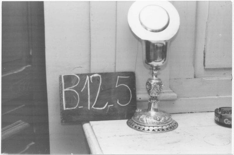 Pied à frise dentelée ajourée. Décor des Instruments de la Passion et trois têtes d'angelots rapportées. Haute tige avec collerettes perlées. Noeud à gros fruits et trois têtes d'angelots. Coupe unie moderne.