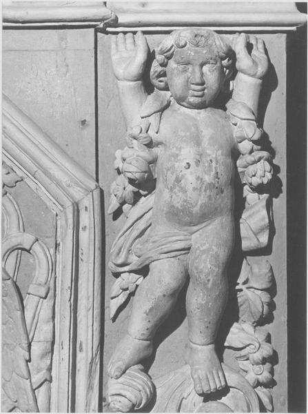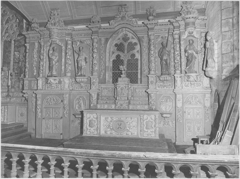 Concernant le retable central : un très long autel prend place devant le vitrail. Au-dessus un tabernacle posé sur des gradins coupés et remaniés. Il est composé de deux volets latéraux. Au-dessus des volets, deux frontons arrondis portent des statuettes d'anges assis sur les rampants. Au centre, deux anges debout, les bras levés devaient tenir un dais ou une couronne. des pots à feux et à fleurs soulignent l'ensemble du tabernacle. Pour porter l'entablement, il subsiste deux colonnettes e chaque côté des volets. Les colonettes manquantes ont été remplacées par six statuettes d'anges. de chaque côté du vitrail, deux niches encadrées de colonnes torsadées à chapiteaux corinthiens reçoivent deux statues, à gauche Joachim, à droite saint Joseph. A leurs côtés, deux autres niches occupées à gauche par sainte Marie, à droite par sainte Anne. les deux femmes se font face. Ces niches sont couronnées par des médaillons sur panneaux de bois : à gauche, une tête d'ange enrubannée de feuillages et de fleurs, le médaillon est orné d'un croix, un aigle occupe le côté droit ; à droite, une tête d'ange enrubannée de feuillages et de fleurs, le médaillon est orné d'un calice, un aigle occupe le côté gauche. Au-dessus du vitrail, le père éternel sort d'un nuage, deux têtes d'anges à ses côtés soutiennent une longue draperie qui vient couronner la fenêtre. Description iconographique : 4 niches latérales au vitrail dans lesquelles prennent place, de gauche à droite, sainte Marie, saint Joachim, saint Joseph et sainte Anne. La porte du tabernacle est sculptée d'une représentation du sacrifice d'Isaac (Abraham tient de sa main gauche l'épaule d'Isaac tandis que de sa main droite armée d'un glaive est arrêtée par un ange). Sur les volets du tabernacle, présence de deux médaillons, à gauche la Nativité (l'enfant repose sur un pan de tissu qui recouvre la mangeoire ; il semble regarder sa mère, légèrement penchée devant lui, en arrière plan, présence de saint Joseph) à droite, représentation de l'Assomption, Marie monte au ciel accompagnée par des anges. Quatre statuettes assises en enfilade sur les volets du tabernacle représentent les évangélistes : de gauche à droite Mathieu, Luc, Marc et Jean. Sur les panneaux latéraux du tabernacle, deux niches abritent à gauche saint Jean et à droite saint Luc. Sur la contre-table de l'autel, deux médaillons sont présentés latéralement. A gauche, représentation de l'Annonciation (le saint Esprit représenté sous la forme d'un colombe marque le caractère surnaturel de la scène. La Vierge se tient près d'un livre ouvert sur la prédiction d'Isaïe, à sa droite l'ange Gabriel tient un lis dans sa main gauche et pointe l'index droit vers le ciel) à droite, la Visitation (rencontre de deux femmes, la scène se passe en plein air devant une maison).£Concernant le retable nord : des soubassements latéraux à l'autel, richement sculptés d'anges, de chutes de feuillages, de fleurs, de médaillons et de scènes iconographiques. Sur l'autel, un tabernacle avec deux rangées de gradins sculptés, légèrement recoupés sur la longueur ; au-dessus, deux anges prennent appui sur un dôme qui était en fait un dais se positionnant bien plus haut ; un pot à fleurs couronne ce dais. De chaque côté du vitrail, deux niches encadrées de chutes de feuillages et de fleurs où prennet place à gauche saint Jean-Baptiste et saint Laurent, à droite sainte Marie-Madeleine. Au-dessus du vitrail, un dais est fixé sur le mur. L'ensemble est rythmé de six colonnes à chapiteaux corinthiens ; ces colonnes portent un entablement classique. L'architrave et la frise ont été coupées afin de laisser un emplacement pour des éléments sculptés apocryphes prenant place au-dessus de chaque niche. Description iconographique, de gauche à droite, nous trouvons dans les niches : saint Jean-Baptiste, saint Laurent, saint Louis et sainte Marie-Madeleine tandis que les bas reliefs sous les niches représentent : le baptême du Christ (composition simple, Jésus est représenté dans l'attitude de la prière, recevant sur sa tête l'eau baptismal versée par Jean. La colombe du saint Esprit plane au-dessus du Christ. Présence d'un ange envoyé du ciel qui participe à la solennité de l'instant) saint Laurent (le saint porte la dalmatique du diacre et le gril de son supplice. Sur la droite, un personnage plus petit semble lui parler) saint Louis (représentation du saint en buste, il porte une couronne royale fleurdelisée qui a été bûchée, appuyée sur une épée et un sceptre formant un X) bas-relief de trois femmes, elles sont les unes derrière les autres, elles portent des vases. La première, sainte Madeleine, est agenouillée aux pieds d'un ange, derrière lequel on devine un tombeau. En toile de fond, des paysages et des architectures.£Concernant le retable sud : un autel surmonté d'un tabernacle à deux volets latéraux et de deux ra, gées de gradins. Dans les soubassements, deux portes sculptées. l'une d'elle donne accès à la sacristie. Ces portes sont encadrées de consoles d'où jaillissent des chutes de feuillages et de fleurs, et surmontées de frontons richement sculptés d'une tête d'ange centrale. Des statues d'anges assis sur les rampants des volutes tiennent d'une main un vase à fleurs, et de l'autre des guirlandes de feuillages et de fleurs. Au-dessus des stylobates, représentation des évangélistes, de gauche à droite : Marc, Mathieu, Luc et Jean. Ces stylobates portent une grande architecture de colonnes torsadées agrémentées de feuilles de vignes, de grappes de raisin et d'oiseaux. Elles encadrent les niches et les statues de saint Jacques, saint Pierre, saint Paul et saint André. Au-dessus, architrave, frise et corniche règnent sur tout la longueur du retable. Enfin, des cartouches à ailerons et des pots à fleurs viennent couronner ce retable. Le côté gauche du retabl