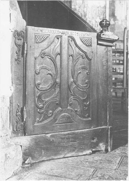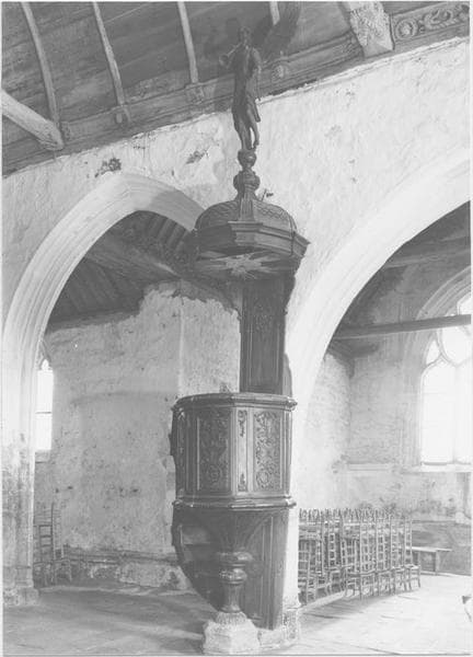 Chaire à prêcher en bois mouluré, avec bas-relief. Cuve hexagonale à pans bombés donnant un plan très proche du cercle. Panneaux séparant les parcloses plats avec soubassement et entablement concaves.