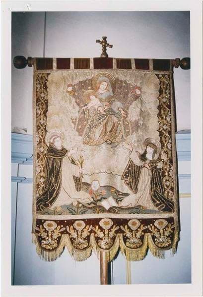 Bannière de procession en tissu brodé de morceaux de tissus et de fils de métal, représentant, sur une face, l'Adoration du Saint Sacrement par deux anges, et, sur l'autre face, la Donation du Rosaire.