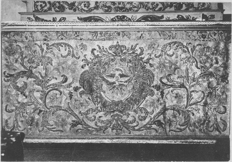 bois : taillé, polychrome ; soie : brodé ; fil métal ; perle