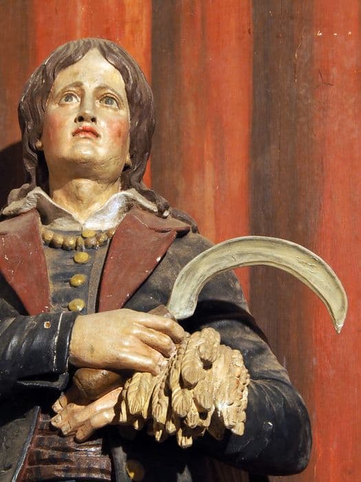Saint Isidore, patron des laboureurs et des fermiers, porte le 'turban', ou large ceinture, typique de la région au 19e siècle.