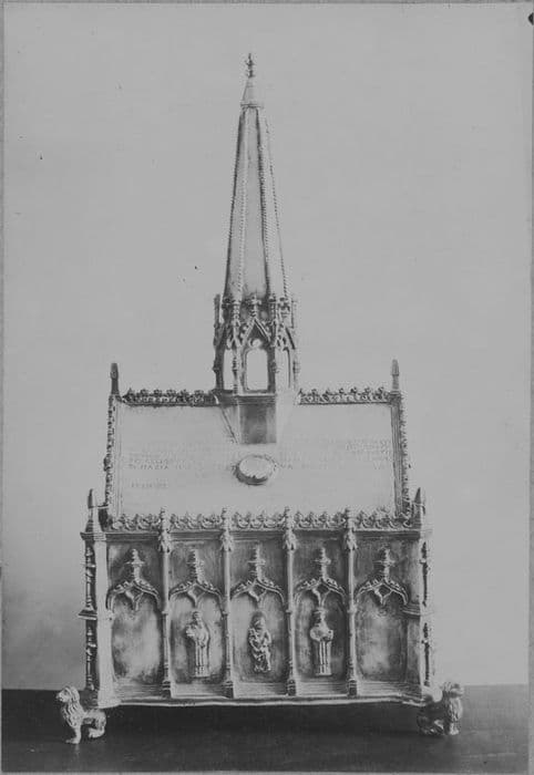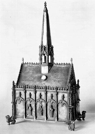 L'objet consiste en une petite châsse en forme de chapelle. Sur chaque face, cinq arcades surmontées d'une accolade et séparées par des contreforts abritent des statuettes de saints. Au niveau du toit, une loupe laisse voir les reliques.