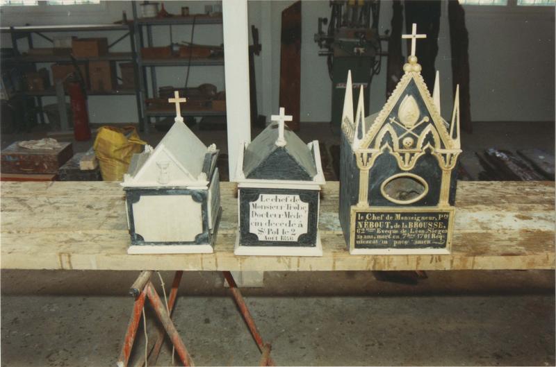 Inscription : les noms et la date de décès figurent sur la face antérieure de chaque reliquaire.