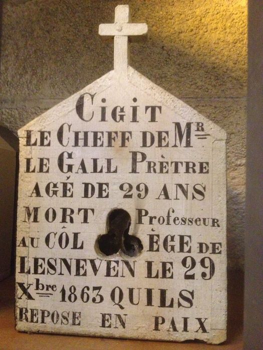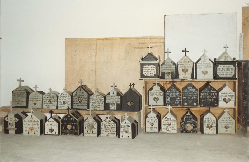 35 boîtes en forme de chapelle surmontée d'une croix. La face antérieure, percée d'un coeur ou d'un trèfle, laisse apercevoir chaque crâne à l'intérieur. L'une des boîtes est vide (vol d'un crâne en 1984).
