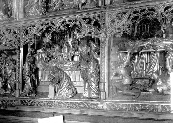 11 statuettes volées le 6-7 novembre 1973, 3 retrouvées en avril 1978. Il manque à l'adoration des mages (panneau supérieur gauche) : deux rois mages agenouillés ; à l'adoration des bergers (panneau inférieur gauche) : la Vierge et l'enfant Jésus (mutilé), saint Joseph, un berger à cornemuse et une bergère à lanterne, l'ange agenouillé en prière a été retrouvé en 1978 ; à la dormition de la Vierge (panneau en bas au centre) : un apôtre agenouillé devant un banc lisant un livre de prière, l'apôtre barbu debout du premier plan à gauche (saint Pierre), l'apôtre debout lisant du premier plan à droite ; aux funérailles de la Vierge (panneau inférieur droit) : le soldat juif du premier plan à gauche a été retrouvé en 1978 ; au couronnement de la Vierge (panneau central du haut) : un ange musicien a été retrouvé en 1978.