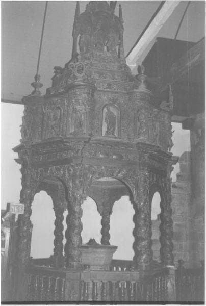 Edicule hexagonal surmontant les fonts baptismaux. Un entablement à huit pans et à ressauts dans les angles repose sur huit colonnes torses à chapiteaux corinthiens. Seize statues décorent le tambour octogone qui repose sur la corniche. Le dôme supérieur est tronqué par un double lanternon abritant un groupe sculpté, le Baptême du Christ, et un ange aux ailes éployées couronne l'amortissement.