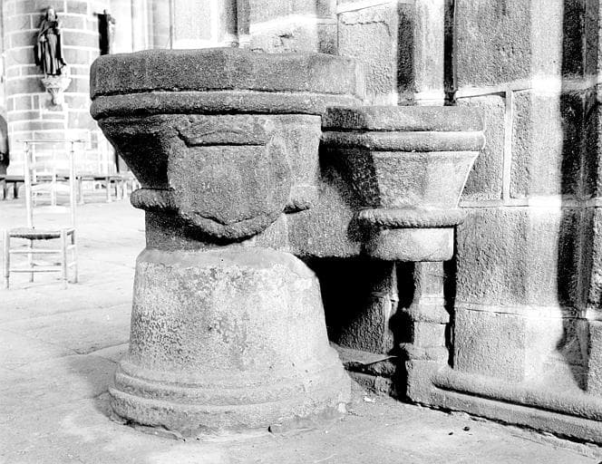 Cuves geminées, une grande et une petite. Toutes les deux en forme de tronc de pyramide renversé. La grande cuve repose sur un support de granit ayant la forme d'une cloche.
