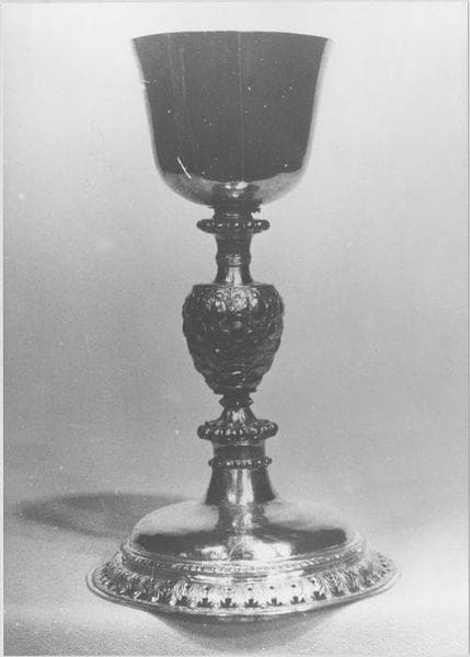 Pied rond à bordure ajourée avec feuilles d'acanthe en frise. Dessus du pied en doucine. Collerette à perles, avec dessous une bague, terrasse feuillagée. Noeud ovoïde, gorge avec bague, collerette à perle. Coupe évasée unie.