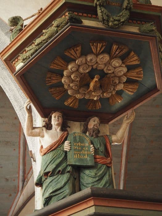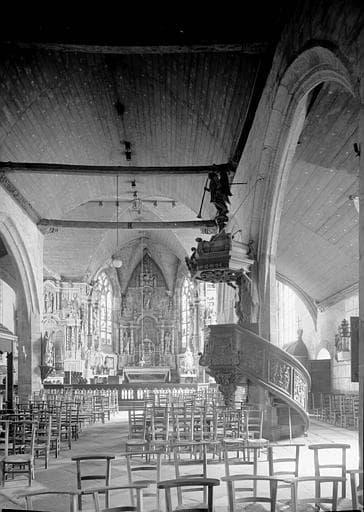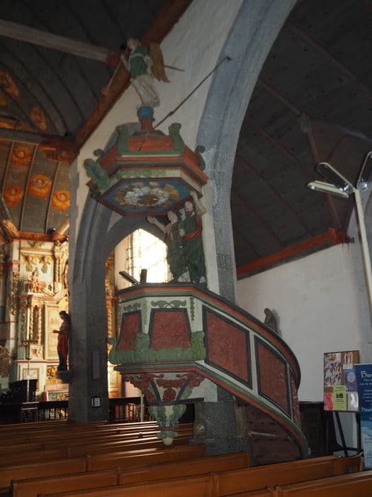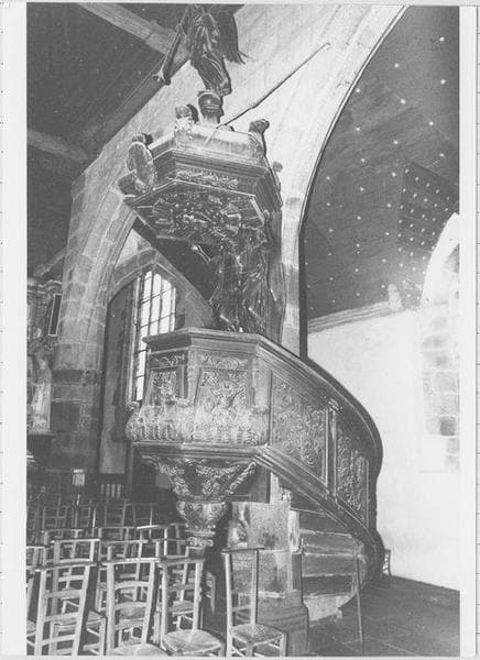 Chaire richement ornée, dont l'abat-son est soutenu par deux cariatides (deux anges), et surmonté d'un ange sonnant de la trompette. Les quatre évangélistes sont représentés sur les quatre faces de la cuve. Cette chaire est vraisemblablement polychromée sous le lourd badigeon brun foncé qui la recouvre entièrement aujourd'hui.