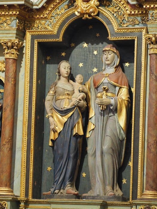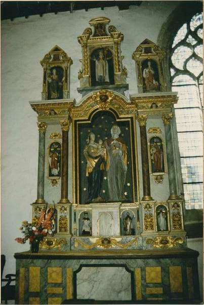 7 statues : Vierge à l'Enfant, Sainte Anne, Saint Joachim, Saint Joseph, Sainte Barbe, Sainte Marguerite, Saint évêque