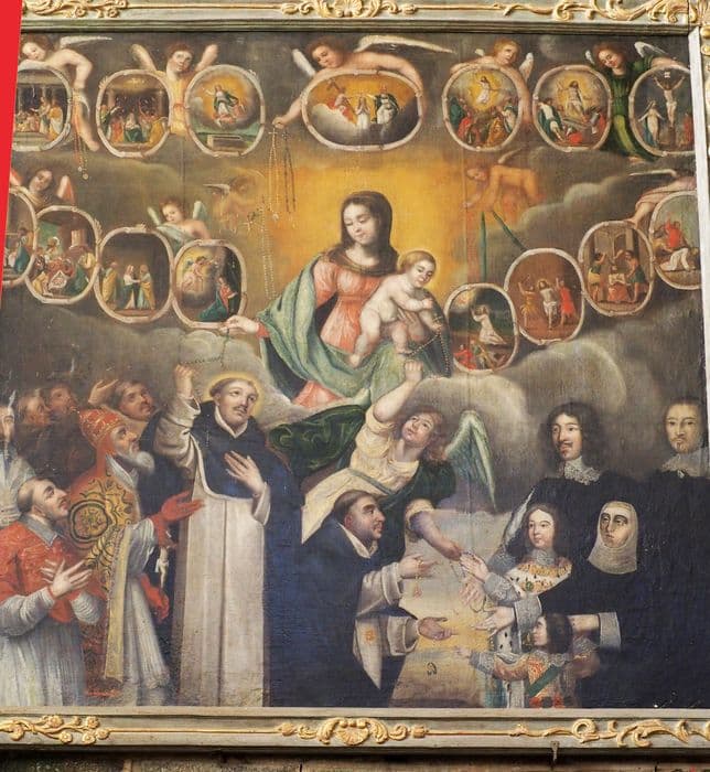 rosaire ; don ; Vierge à l'Enfant ; nuée ; angelot ; saint Dominique ; sainte Catherine ; pape ; homme ; scène biblique ; en médaillon ; vie du Christ
