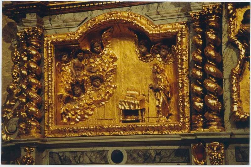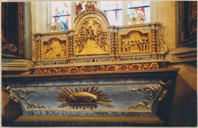 Retable à trois panneaux sculptés : l'Annonciation, l'Assomption, et la Dormition de la Vierge.