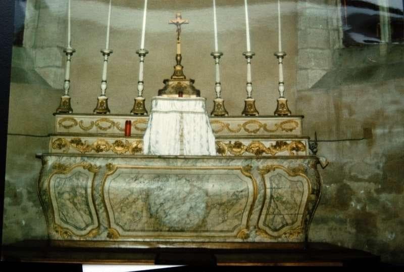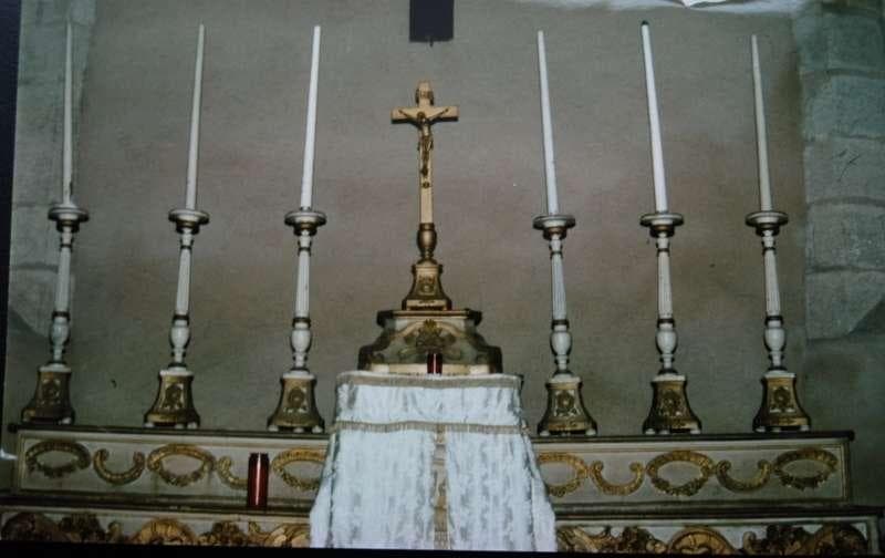autel ; gradin d'autel (2) ; tabernacle ; croix d'autel ; chandelier d'autel (6)