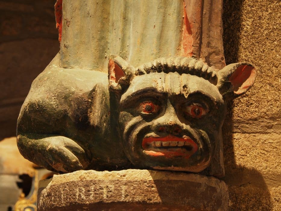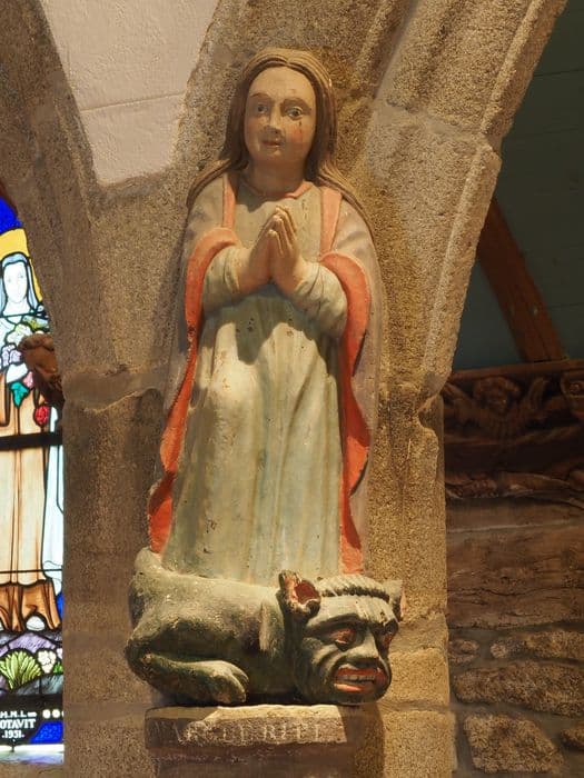 Sainte aux cheveux longs, mains jointes, dragon tourné vers la droite, tête aux traits humains.