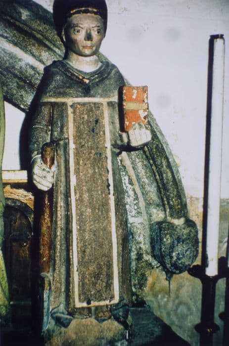 Vêtu d'une longue chasuble, coiffé d'un bonnet rond, le saint tient de la main droite une bêche et un livre de main gauche.