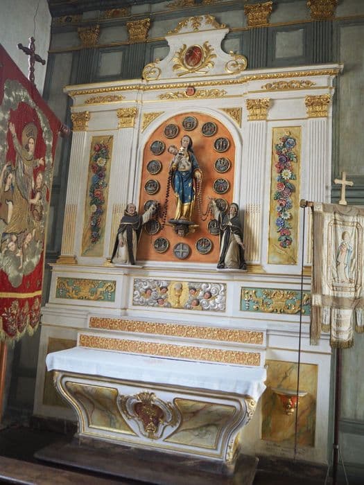 autel et retable du Rosaire ; 3 statues : la Vierge à l'Enfant, Sainte Catherine, Saint Dominique