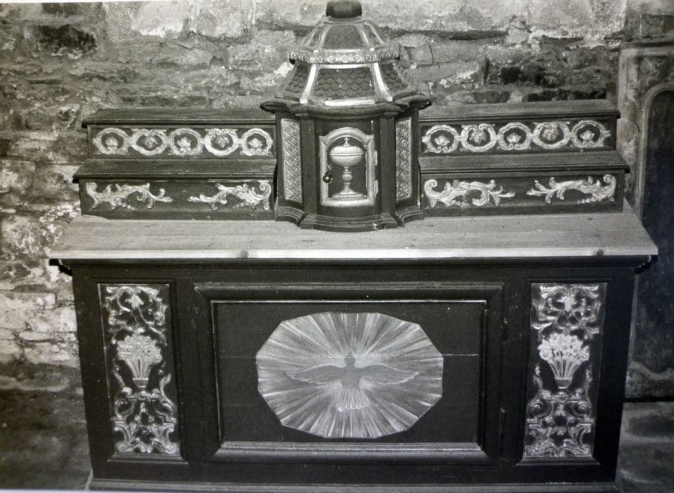 Coffre galbé, orné d'un Saint-Esprit, dans le style de la fin du XVIIIe siècle, sur lequel on a monté récemment deux gradins à fleurs dans la notre XVIIe siècle, provenant de la réserve du presbytère. Le tabernacle est surmonté d'un haut baldaquin assez léger terminé par un bouquet de fleurs.
