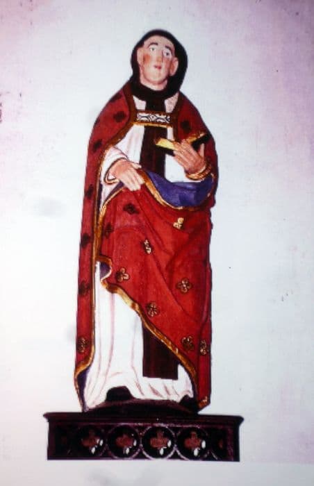 Saint Idunet en moine, capuchon sur la tête, avec chape, livre ouvert dans la main gauche.