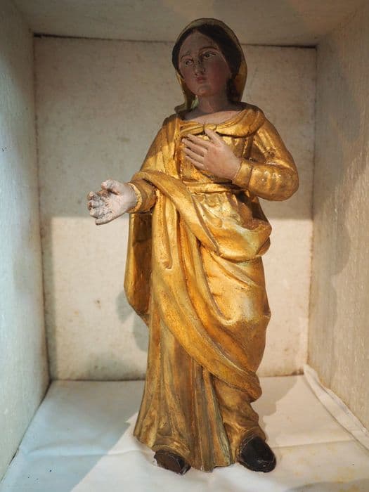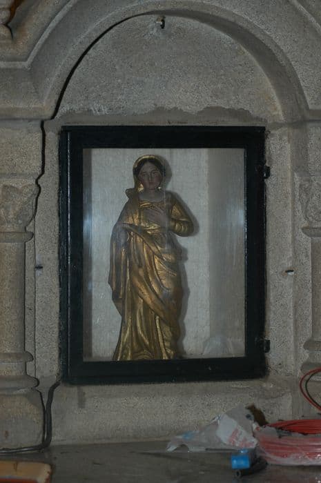 Dans la niche vitrée, posée sur la table de l'autel de l'église.