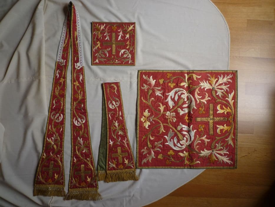 chasuble ; étole ; manipule ; voile de calice ; bourse de corporal