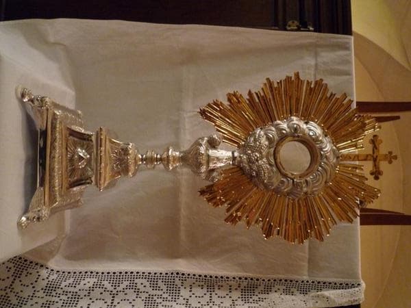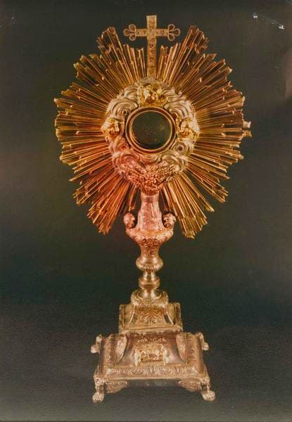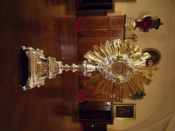 Décor trilobé. Décor feuille de vigne et grappes de raisin. Socle carré soutenu par des pieds ornés de têtes d'angelots dont les ailes sont ouvertes horizontalement au niveau de la tête. Deux têtes d'angelots de part et d'autre du pied entre des tiges de blé liées entre elles par un ruban à la naissance des épis de blé sous la custode