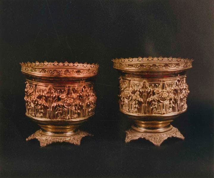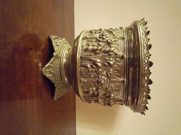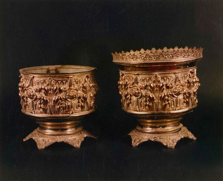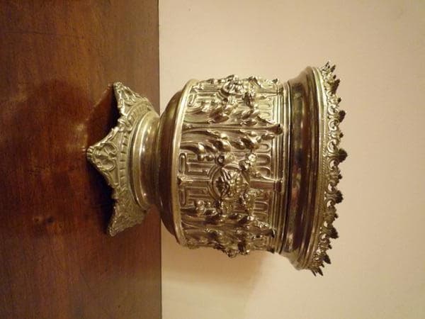 Décor de feuilles d'acanthe entre des rosaces. Socle formé de six pieds ornés de palmettes. Bord orné de décor végétal stylisé.